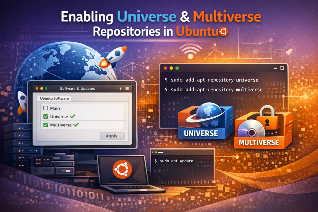 Enabling the Universe and Multiverse repositories in Ubuntu significantly expands the range of software available to the system. These repositories become especially important when you need community-maintained tools, additional dependencies, or packages that fall outside the standard supported software set.
