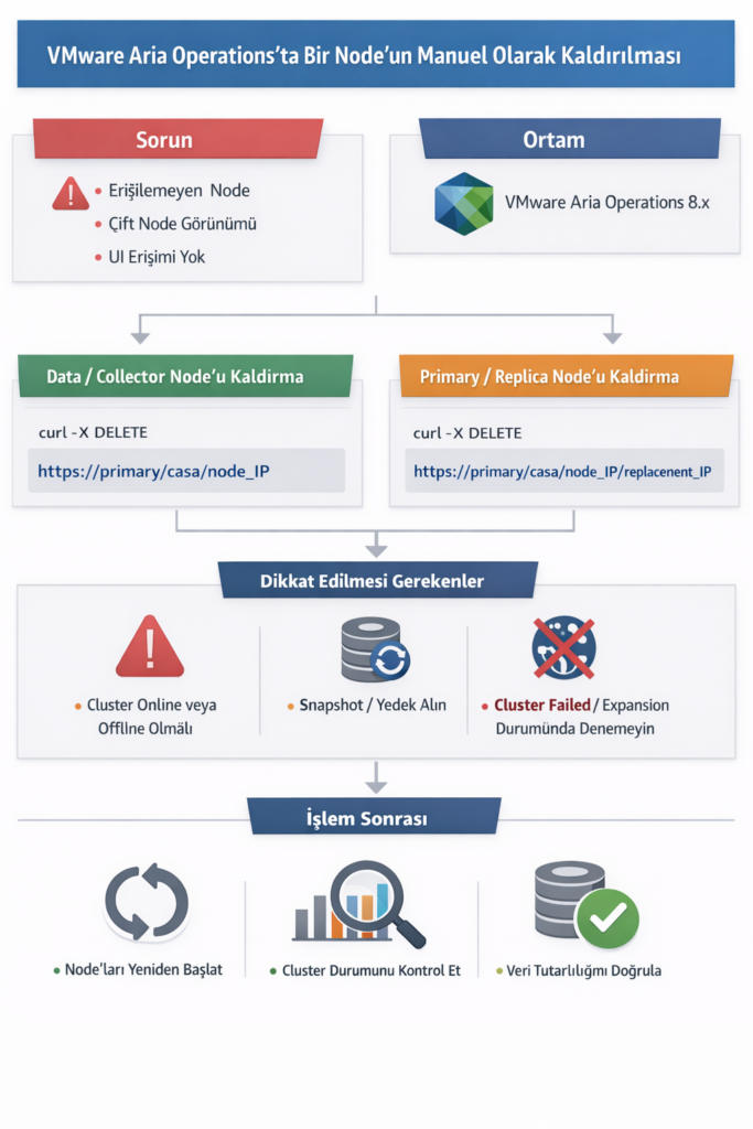 VMware Aria Operations cluster yapısında node yönetimi kritik bir konudur. Normal şartlarda node ekleme ve çıkarma işlemleri UI üzerinden sorunsuz şekilde yapılmalıdır. Ancak bazı istisnai durumlarda manuel müdahale kaçınılmaz hale gelir.