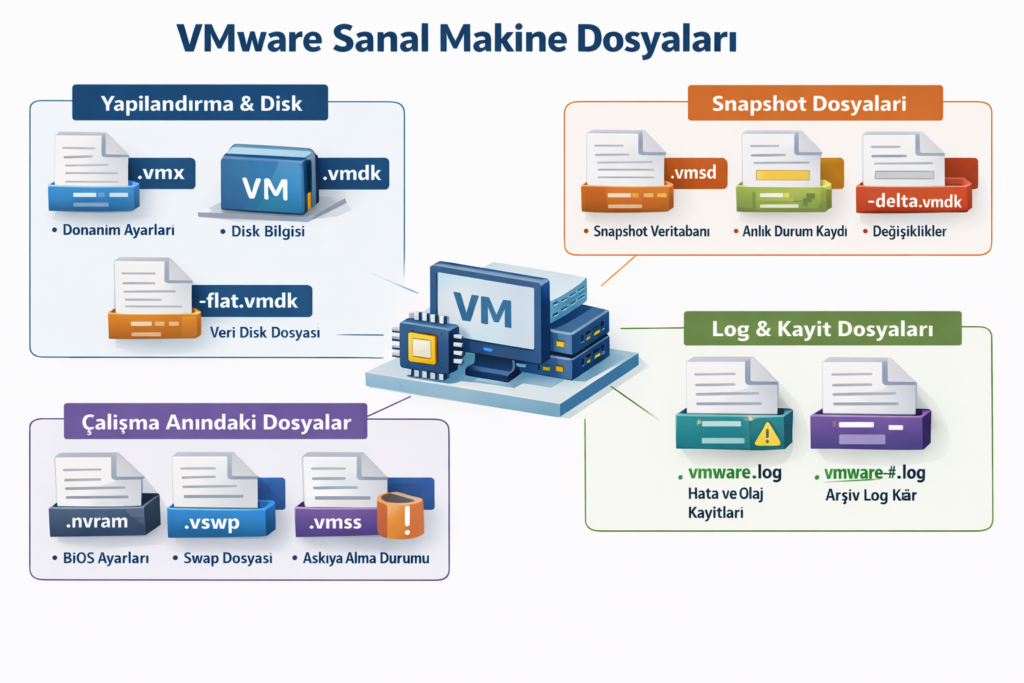 Özellikle vSphere, ESXi ve benzeri VMware altyapılarında çalışan sistem yöneticileri için bu dosyaları tanımak büyük önem taşır. Çünkü bir sanal makinede yaşanan performans sorunu, açılış hatası, snapshot karmaşası veya disk erişim problemi çoğu zaman doğrudan bu dosyalarla ilişkilidir. Bu nedenle VMware sanal makine dosyalarını yalnızca isim olarak bilmek değil, ne işe yaradıklarını ve hangi durumda karşımıza çıktıklarını anlamak gerekir.