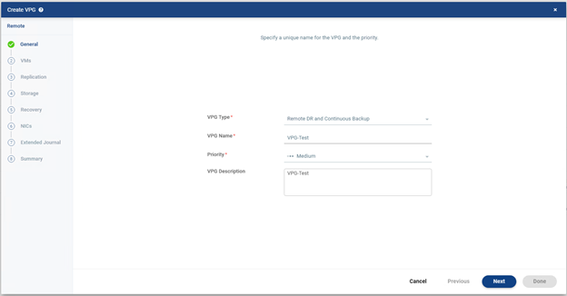 İlk aşamada oluşturulacak VPG için temel bilgiler girilir. Burada genellikle VPG adı, öncelik seviyesi ve açıklama gibi alanlar bulunur.