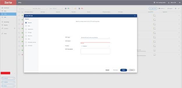 VPG oluşturmak için öncelikle Zerto yönetim arayüzüne giriş yapılır. Ardından sol menüden ya da ilgili bölümden VPGs ekranına geçilir ve burada bulunan New VPG seçeneği kullanılarak yeni bir koruma grubu oluşturulmaya başlanır. Bu işlemle birlikte Zerto’nun sihirbaz yapısındaki yapılandırma ekranı açılır.