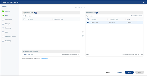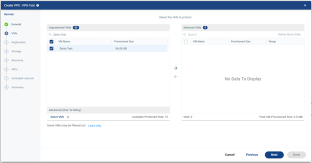 Sol tarafta yer alır. Henüz bu VPG’ye eklenmemiş VM’leri gösterir. Senin örneğinde Zerto-Test isimli sanal makine burada görünüyor.
