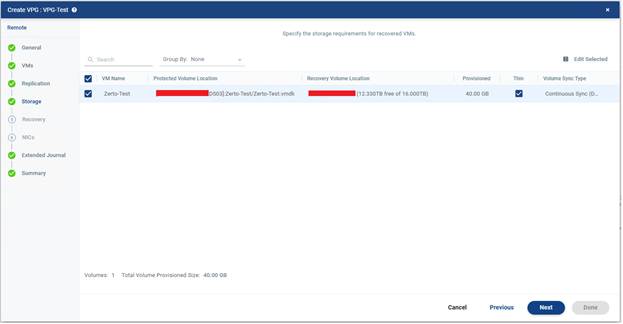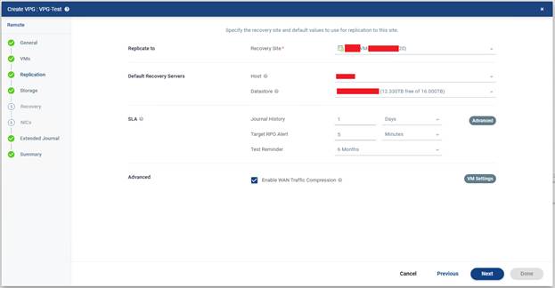 - Recovery Site: Burada replikasyonun gönderileceği hedef site seçilir. Yani bu VPG içindeki VM’ler bu uzak site’a replike edilecek.