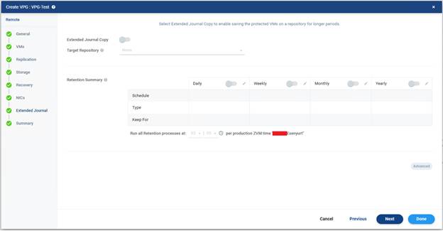Sağ altta görünen “Advanced” butonu extended journal için daha detaylı ayarların yapılabildiği bölümdür. Burada daha gelişmiş retention davranışları veya repository kullanım detayları yönetilebilir. Şu an pasif görünmesinin nedeni yine Extended Journal Copy’nin kapalı olmasıdır.