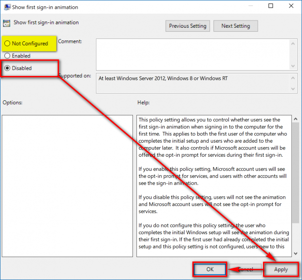 “Show first sign-in animation” Ayarını Bulunuz