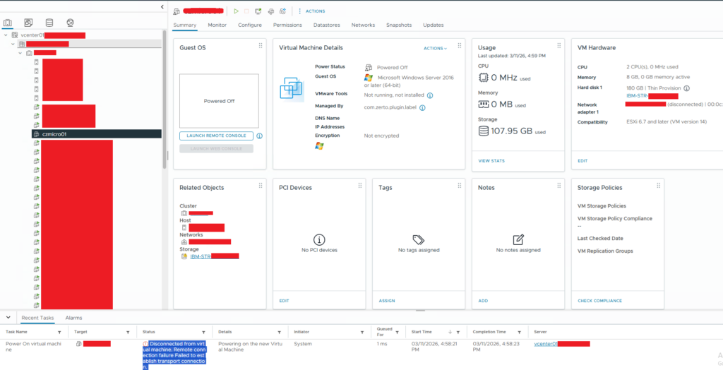Zerto üzerinden gerçekleştirilen Failover veya Live Test işlemi tamamlandıktan sonra hedef ortamda oluşturulan sanal makine açılmak istendiğinde aşağıdaki hata mesajı ile karşılaşılabilir:
