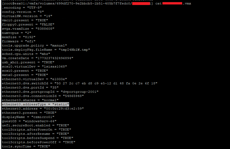 less /vmfs/volumes/DATASTORE_NAME/VM_NAME/VM_NAME.vmx | grep addressType